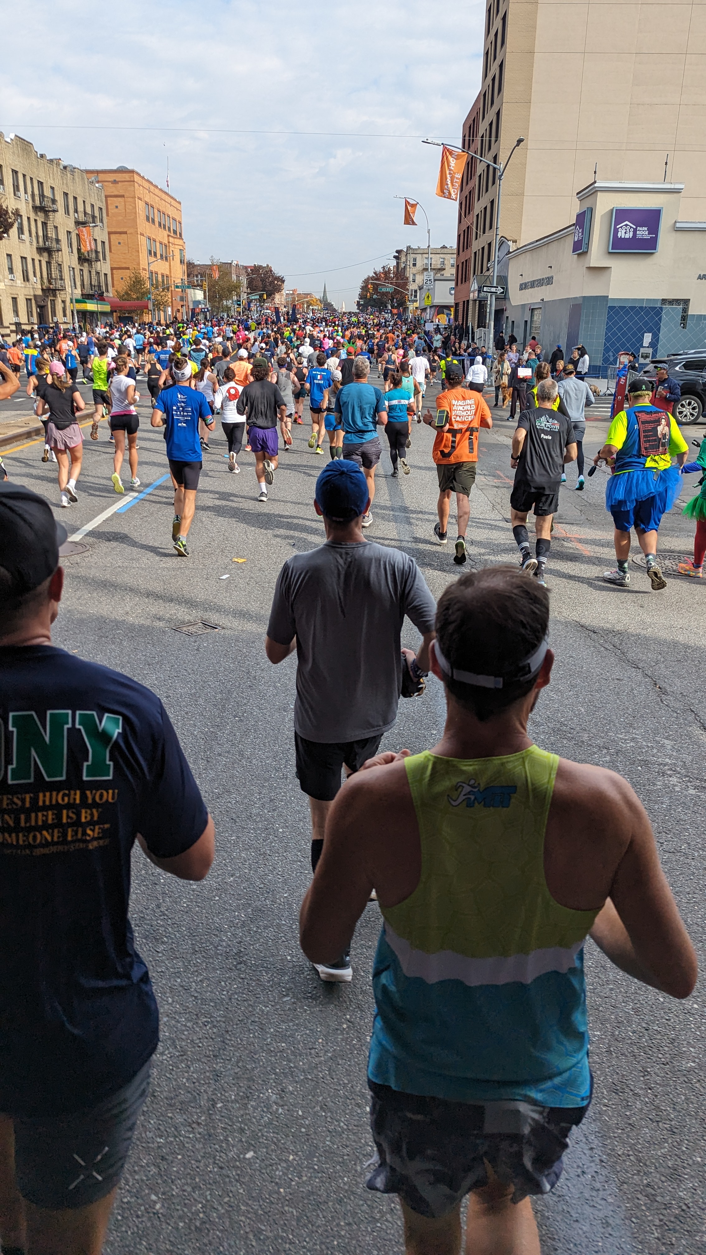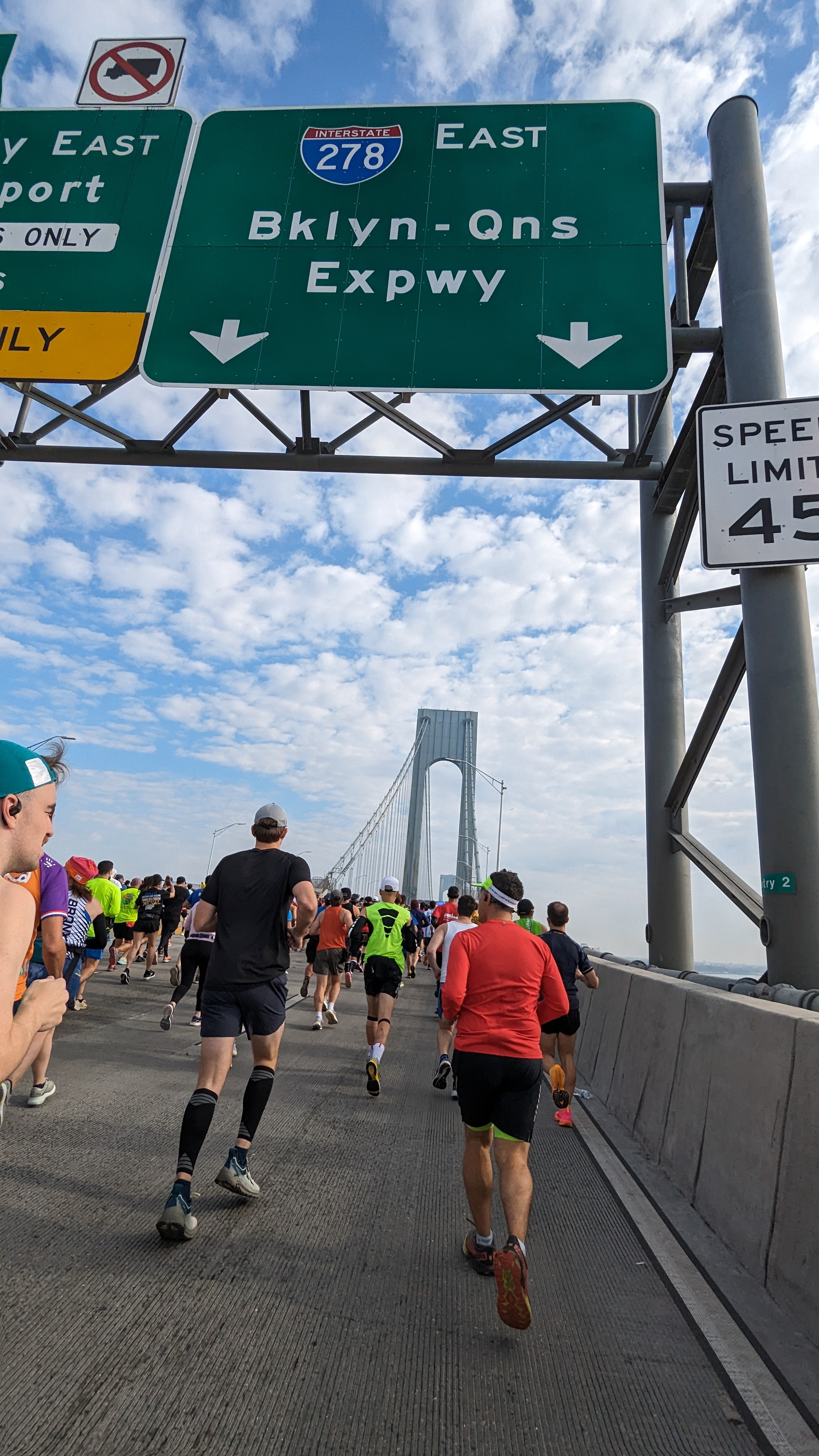 Fast forward ten years and 30+ half marathons later and I'm sitting by myself on a grassy knoll in Staten Island at 6:30 am in the runner's warm-up area next to the longest queue for the porta-potties I've ever seen. I brought some lightweight reading material to keep me occupied before the start time that would prevent me from using my phone in hopes of preserving its battery. The said reading material is a 100 page manual about project management and agile software development - not exactly a thriller but it is enough to keep me at peace and my mind away from any pre-race anxiety. It sparked some conversation with another fellow runner sitting by herself, who as it turns out was also running the NYC marathon for the first time. She's equally nervous about the race and doesn't know how she'll do but tells me her goal is just to finish the race. Same, friend. Same.